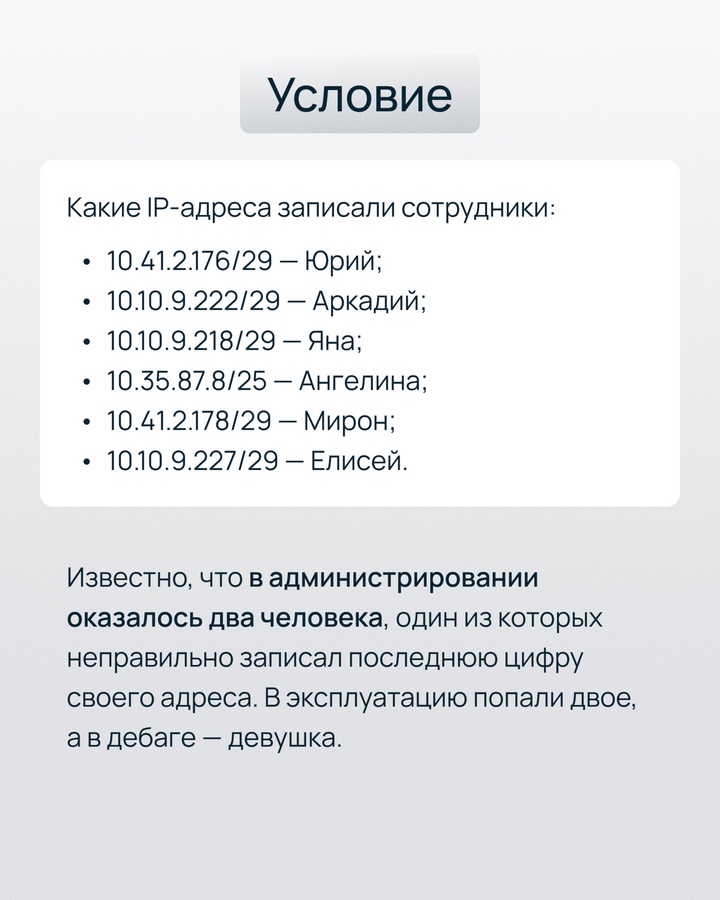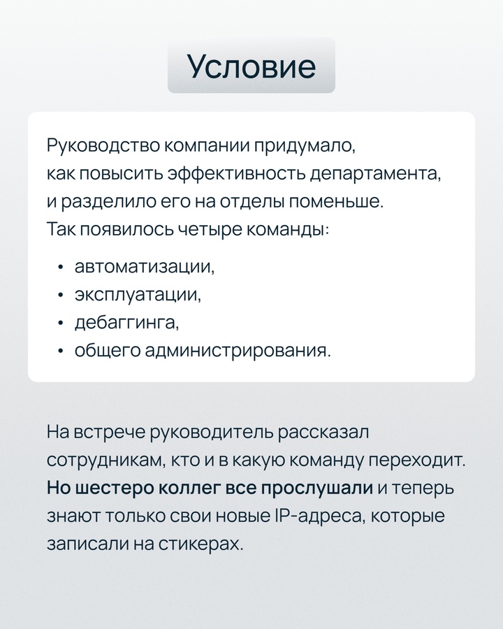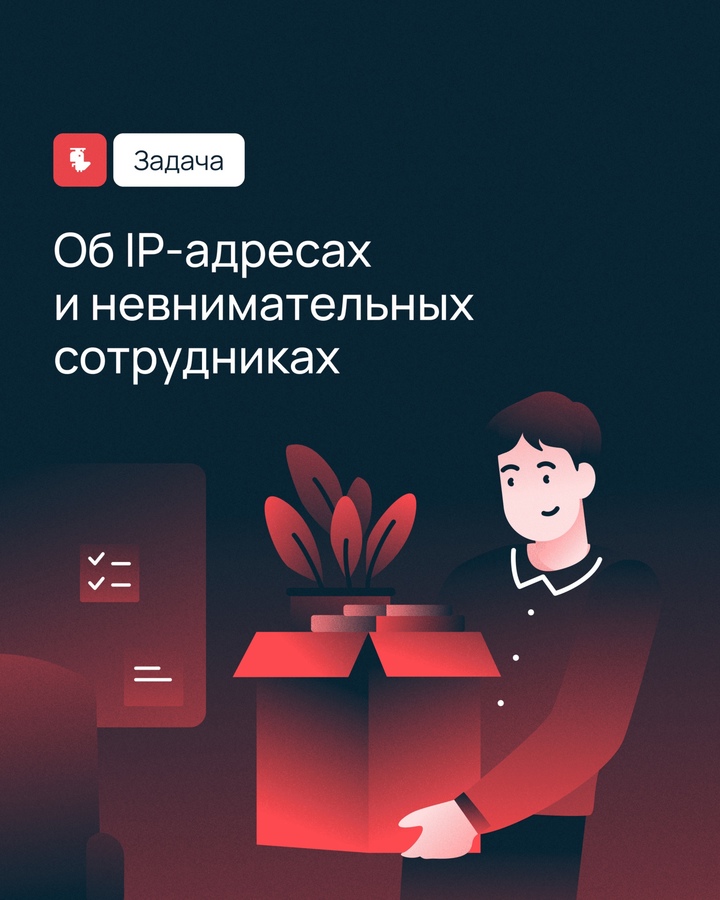Героям нашей задачи точно знакомо. Они случайно прослушали, в какие команды их переводит руководство, и знают лишь IP-адреса новых отделов. Скорее помогите сотрудникам попасть на рабочее место, пока их не уличили в прогуле!